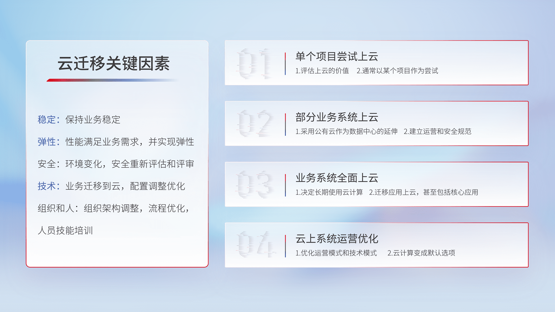 结合实际业务,,从规划设计、、、、云平台选型、、、、云原生改造、、、、数据迁移、、、、集成交付,,,,迁移全过程为客户识别最佳上云路径,,做好风险识别管理,,,设计网络架构、、、、身份权限、、、、安全审计合规、、、操作审计、、、、日志审计、、监控告警策略、、多站点容灾设计等,,对云上基础设施进行整体规划,,,,提升IT治理水平,,,,以满足弹性、、、高可用、、、高性能的需求。。