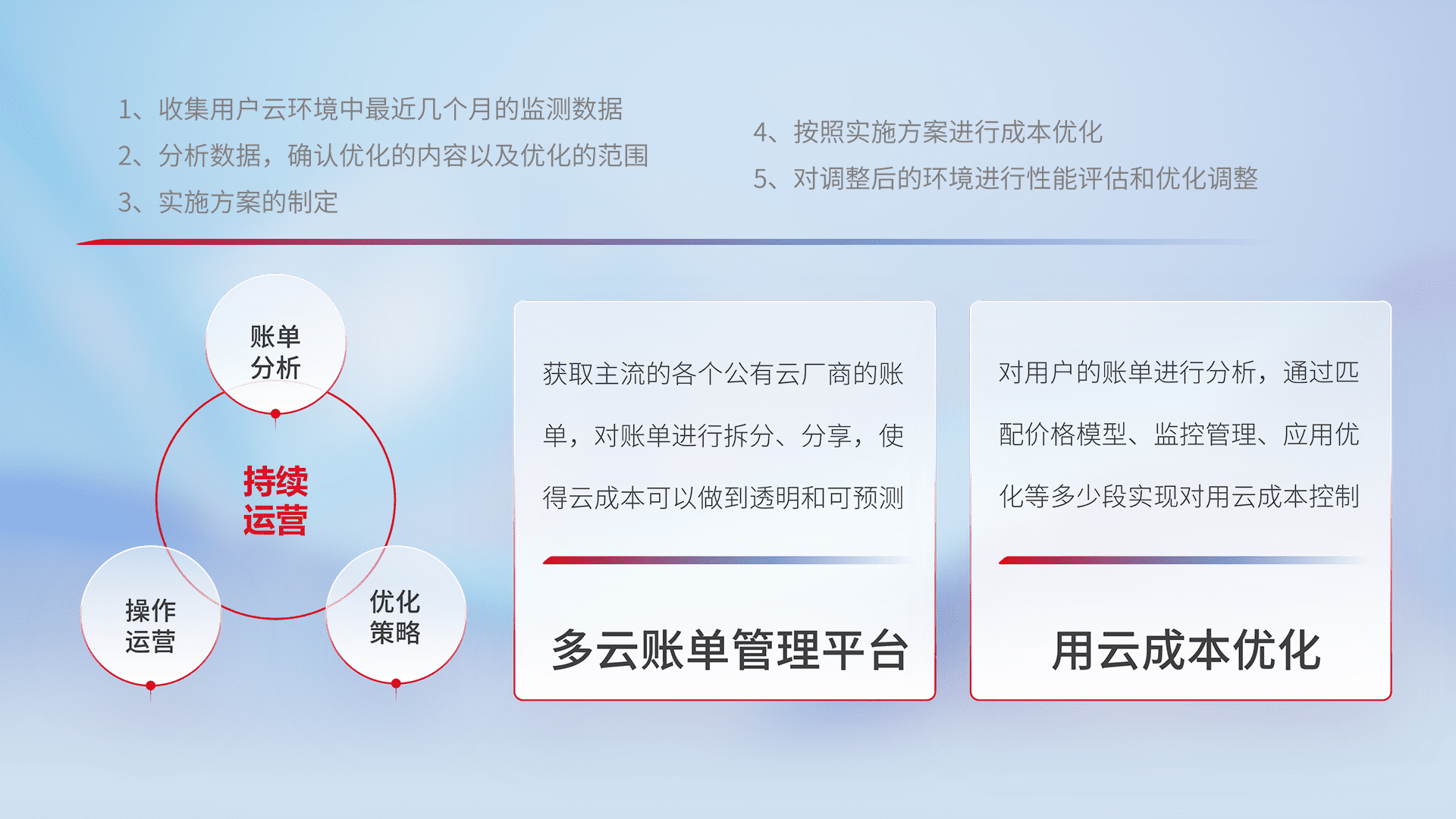通过多云纳管,,,以统一的资源数据模型把客户的云资源进行抽象和封装,,,进而实现对多云资源的统一操作,,,保障云资源管理的可靠性、、、稳定性与可用性。。。。量身定制化运维内容,,配置、、、开发运维、、、、补丁管理、、、、备份、、、监控、、认证和访问管理、、、、审计和日常巡检等,,,,保障在用云过程中的可靠度,,稳定度以及高可用率。。。